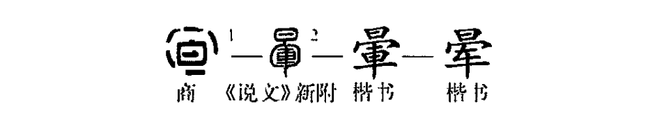 我們看甲骨文①的形體,大概能得知其義,中間是個(gè)“日”(太陽(yáng)),周?chē)莻€(gè)光圈。小篆②只保留了“日”字,而它的下部則加了個(gè)“軍”字表示讀音,這就成了“從日軍聲”的形聲字了。③是楷書(shū)的形體,是直接由小篆變來(lái)的。④是簡(jiǎn)化字,僅把“軍”字簡(jiǎn)化為“車(chē)”罷了。