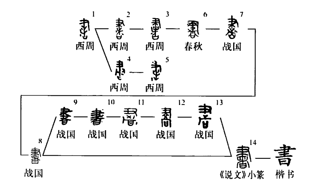 (古文旅)聲的形聲字,在書(shū)字中表聲,書(shū)與者并舌面音魚(yú)韻。者是書(shū)的源頭、聲首、初文,初時(shí)以者表書(shū),后乃分化出專(zhuān)字書(shū)。西周時(shí)書(shū)作從聿,者聲。者字見(jiàn)于商代甲骨文,“楮”之初文,甲骨文作根干枝莖狀,或加飾件