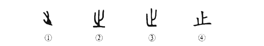 這個(gè)“止”字是個(gè)象形字。甲骨文①多像一只腳??!腳趾朝左,腳后跟朝右。②是金文形體,③是小篆形體,這兩種形體非常類(lèi)似。④是楷書(shū)的寫(xiě)法,由小篆直接變來(lái)。