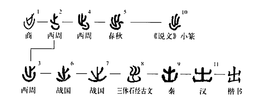 ,楷書(shū)的“出”字即由后者演變而成。本義是從里面到外面(跟“入”相對)。《集韻·至韻》:“出,自?xún)榷庖病?/strong>”《詩(shī)·鄭風(fēng)·出其東門(mén)》:“出其東門(mén),有女如云。” 《三國志·蜀書(shū)·諸葛亮傳》:“出于子口,入于吾耳。”引申指離開(kāi)。《玉篇·出部》:“出,去也。” 《詩(shī)·齊風(fēng)·嗟》:“終曰射侯,不出正兮。” (侯:用布或獸皮做的箭靶。正zhēng:靶心)又引申指發(fā)出。《商君書(shū)·更法》:“于是遂出墾草令。” 《史記·屈原賈生列傳》:“入則與王圖議國事,以出號令。”又指拿出,交納。漢曹操《抑兼并令》:“戶(hù)出絹二匹、綿二斤而已。”又指支出。漢桓寬《鹽鐵論·貧富》:“量入為出,節儉以居之。”又引申指出產(chǎn),生產(chǎn)。《荀子·富國》:“田肥以易則出實(shí)百倍。” (以:而。易:治理,這里指管理得好)漢桓寬《鹽鐵論·本議》:“故工不出則農用乏。”又指產(chǎn)生,發(fā)生。《荀子·勸學(xué)》:“肉腐出蟲(chóng),魚(yú)枯生蠹。”又引申指出現,顯露。《樂(lè )府詩(shī)集·相和歌辭三·陌上?!?/strong>:“曰出東南隅,照我秦氏樓。”宋蘇軾《后赤壁賦》:“山高月小,水落石出。”又引申指超出,超過(guò)。《孟子·公孫丑上》:“出乎其類(lèi),拔乎其萃。”(冀小軍)——李學(xué)勤《字源》