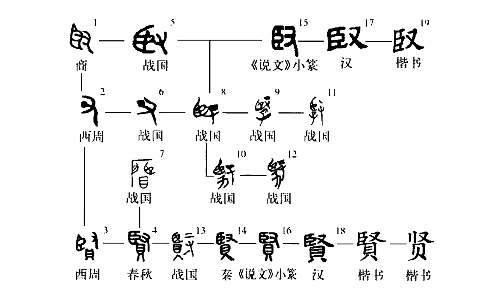 (字形8),則像眼球已被抉出(戰國文字中,“臤”所從之“又”上面多有一筆或兩筆,即此形之變)。古文字多借“臤”為“賢”。《說(shuō)文·臤部》:“臤,古文以為賢字。”柞伯簋:“王遲赤金十反(鈑)。王曰:‘小子、小臣,敬又臤(賢)隻(獲)則取。’”(遲:讀為“陳”,陳列。臤:字形2。《小爾雅·廣詁》:“賢,多也。”此句的完整意思是:王陳列赤金十鈑作為獎品,說(shuō):“小子、小臣,恭敬而射中多的可得到這些獎品。”) 郭店楚墓竹簡(jiǎn)《唐虞之道》:“堯舜之行,愛(ài)親尊臤(賢)。”(字形6)又《語(yǔ)叢四》:“臤(賢)人不在側,是謂迷惑。”(字形8)漢校官碑:“親臤(賢)寶知(智)。”(字形17)《說(shuō)文》:“賢,多才也。”《周禮·地宮·鄉大夫》:“興賢者能者。”鄭玄注:“賢者,有德行者。”“賢”始見(jiàn)于西周金文(字形3),是在假借字上加注意符造出的分化字。國有賢人,猶家之有財,故“賢”字從“貝”。戰國文字或從“賢”省、從“戶(hù)”(字形7),寓家有賢人之意;或從“子”(字形9、11),有尊賢之意;或從“力”(字形10、12),取賢者多力之意。在宋元以來(lái)的一些小說(shuō)戲曲刻本中,“臤”旁多簡(jiǎn)作“