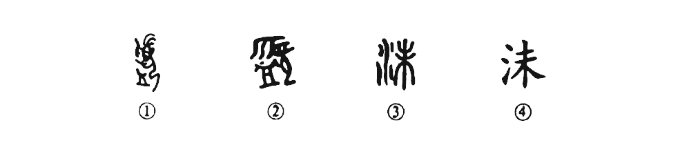 這是個(gè)“沬”(huì會(huì ))字。從甲骨文①看得很清楚,右邊是面朝左彎著(zhù)腰的一個(gè)人,左下部放著(zhù)一個(gè)器皿,左上方是人的手,即用手捧水在洗臉洗頭。金文②也基本上是甲骨文的形象??墒堑搅诵∽劬秃?jiǎn)化成左形(水)右聲(未)的形聲字了??瑫?shū)④與小篆的形體基本一致。