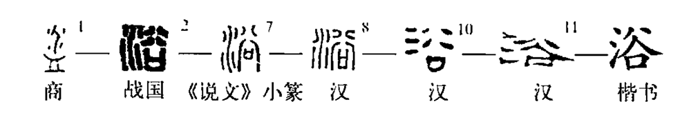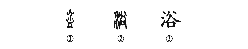 這個(gè)“浴”字本來(lái)是個(gè)會(huì )意字。甲骨文①的下部是一個(gè)大器皿,中間盛有水;水中站著(zhù)一個(gè)曲背彎腰面朝左的人;人的周?chē)兴膫€(gè)點(diǎn)兒,表示人在洗澡??墒堑搅诵∽趧t發(fā)生了偽變,成了左形(水)右聲(谷)的形聲字了。③是楷書(shū)的形體,基本上同于小篆。