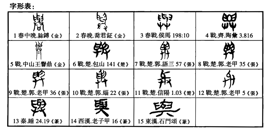 雙聲字。《說(shuō)文》:“與,黨與也。從舁,從與。舁,古文與。”“與”字本從“舁”聲和“牙”聲。戰國文字把所從的“舁”簡(jiǎn)化為“収”。“與”或“