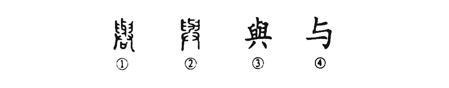“與為千金之裘,而與狐謀其皮。”這個(gè)“與”字本是會(huì )意兼形聲的字。①是金文。四角是四只手,中間是個(gè)“與”字,表音,下面的“口”,表示一個(gè)器物。其大意是一雙手交一件器物給另一雙手。②是小篆的形體,其下部省略了“口”。③是楷書(shū)的形體,直接由小篆演變而來(lái)。④是簡(jiǎn)化字,只保留了楷書(shū)中的讀音部分,書(shū)寫(xiě)時(shí)省事多了。