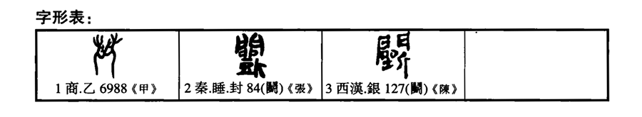 釋形:甲骨文象兩人徒手相鬥,互持對方頭髮之形(羅振玉《增考》中62頁(yè))。睡簡(jiǎn)“鬭”字所從“鬥”已與“門(mén)”形難以區分。