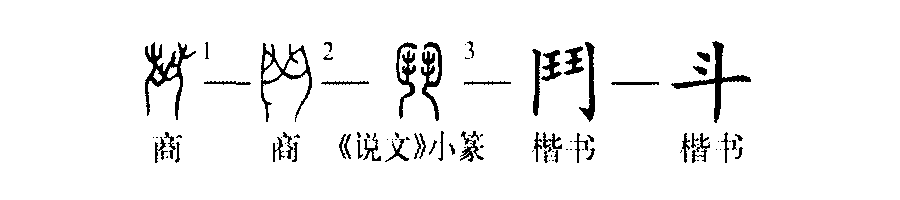 ?這是“斗爭”的“斗”字。甲骨文①是面對面的兩個(gè)武士,頭戴武士帽,伸著(zhù)手互相搏斗。②是小篆的形體,變得不像人形了。③是楷書(shū)的寫(xiě)法。④是簡(jiǎn)化字。