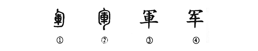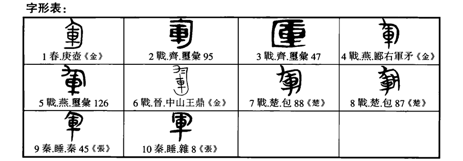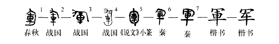 等皆為“勻”形之省變,而秦漢時(shí)代軍字從冖,從宀皆為進(jìn)一步演變。軍隊編制單位當為“軍”字之本義,甲骨文稱(chēng)軍隊為“師”,西周金文亦如此,至春秋金文叔夷鐘、庚壺銘文等始見(jiàn)稱(chēng)軍隊為軍。(周寶宏)