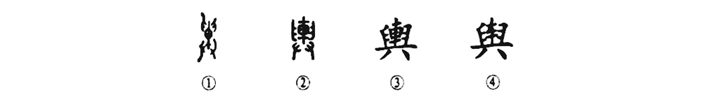 這個(gè)“輿”字是個(gè)會(huì )意字。甲骨文①的四角是四只手,中間是一件東西,這就表明四只手共舉一件東西。②是小篆的形體,中間部分變?yōu)?ldquo;車(chē)”形。③是楷書(shū)形體,直接由小篆演變而成。④為楷書(shū)簡(jiǎn)化字。